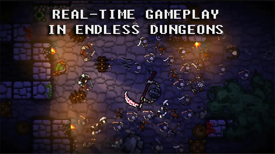 游戏亮点多多,采用无自动战斗的全手动操作,通过虚拟摇杆和技能按键360度自由移动与攻击,考验操作和反应。通关主线后解锁无限地牢模式,怪物随玩家等级动态强化。经典2D俯视角像素画风,结合暗黑美学,营造独特复古视觉和探索感。而且规则硬核,只有清空当前楼层怪物才能回血。